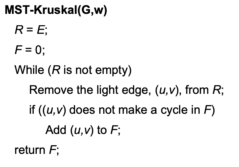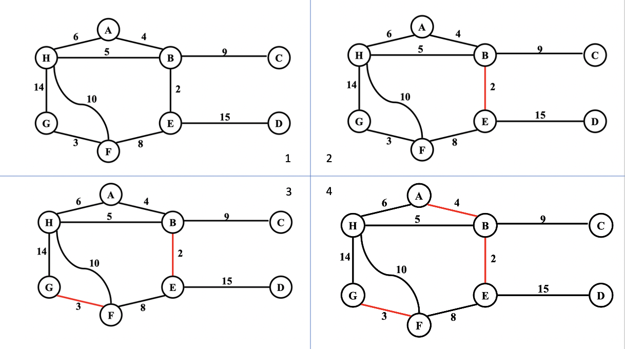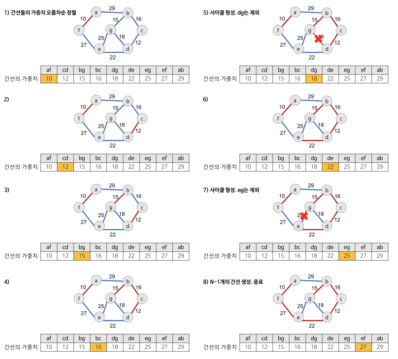 - 정렬된 edge 리스트에서 순서대로 사이클을 형성하지 않는 edge을 선택한다.