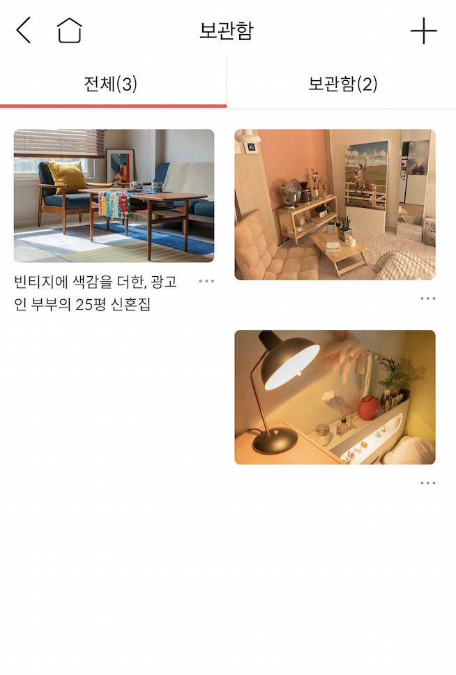 위의 이미지는 '집꾸미기'의 보관함 기능이다. 컨텐츠에 대해서 컨텐츠에서 '보관하기'를 누르면, 위와 같이 보관함에 그 컨텐츠가 담긴다.