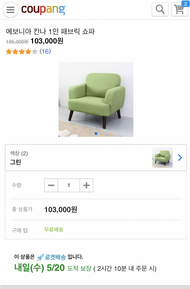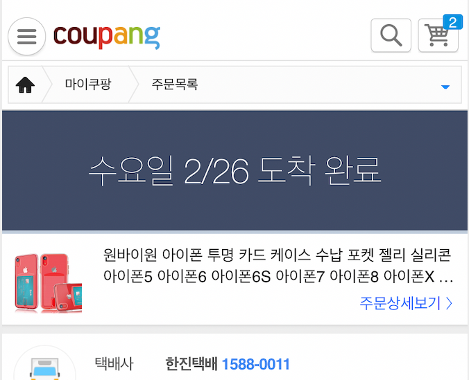 이렇게 쿠팡에서는 상품 페이지에도 현재 주문하면, 언제 도착할지 예상 시간과, 주문을 한 후 마이페이지에서 언제 도착할건지 확인할 수 있다.