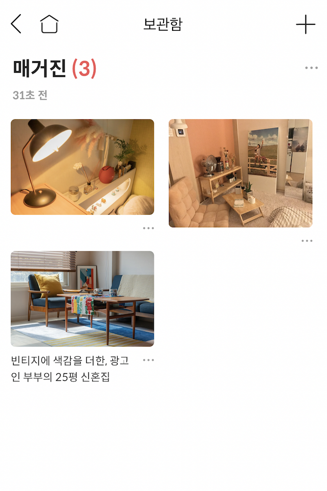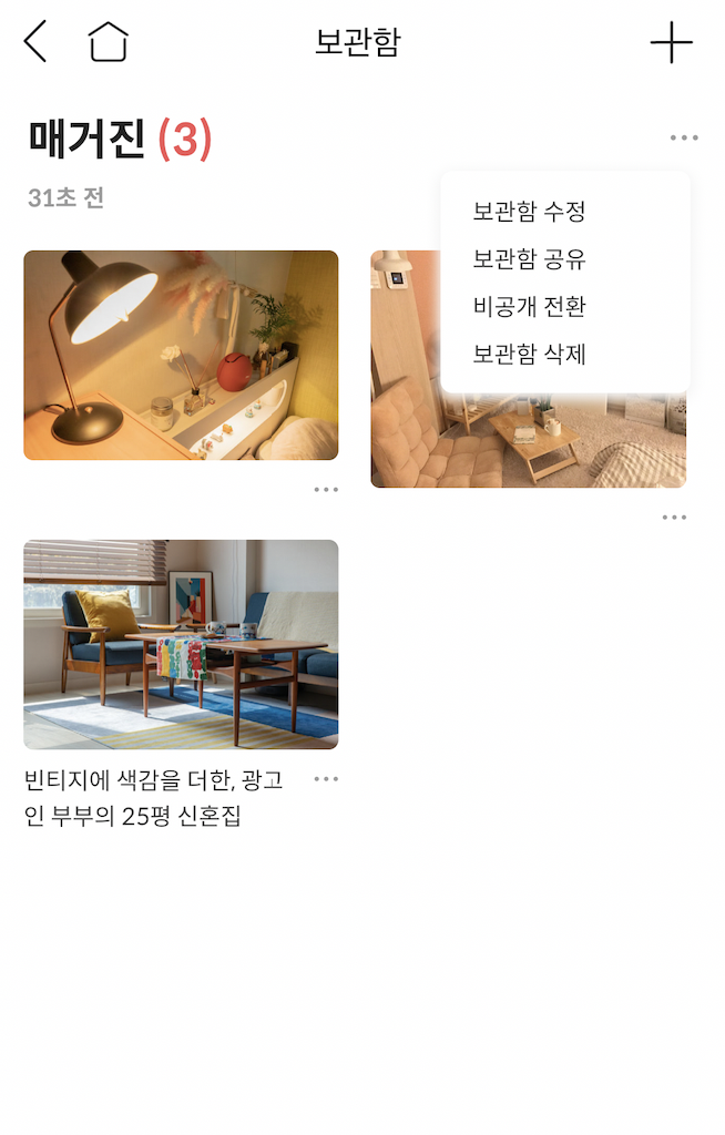 위의 이미지는 보관함 중에서 '매거진'이라는 카테고리에 대한 사진이다. 각 카테고리에 들어가면 위 사진처럼, 해당 카테고리에 있는 항목들을 볼 수 있다. 또한, 항목에 대한 편집 뿐만 아니라,