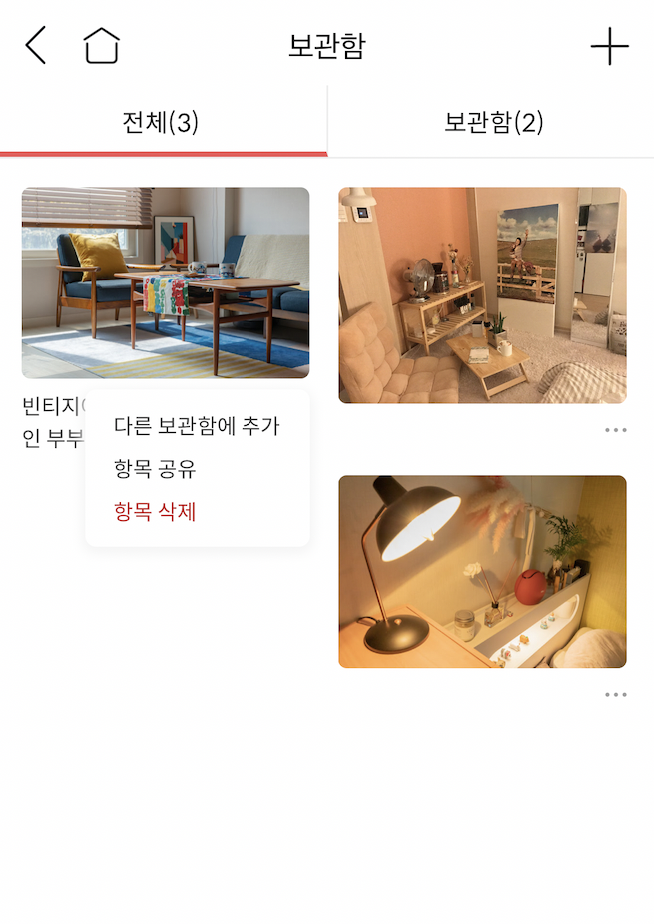 항목 삭제하기를 누르면 그 항목이 삭제되고, 다른 보관함에 추가를 누르면, 이 보관함 기능도 '오늘의 집' 스크랩북처럼 카테고리가 나눠져 있는데, 해당 항목이 있는 카테고리에서 다른 카테고리로 이동하기가 가능하다.