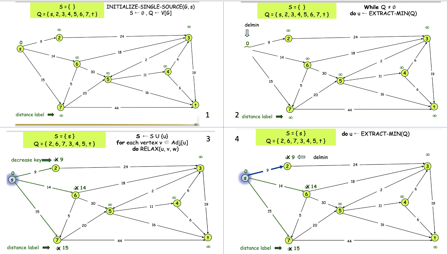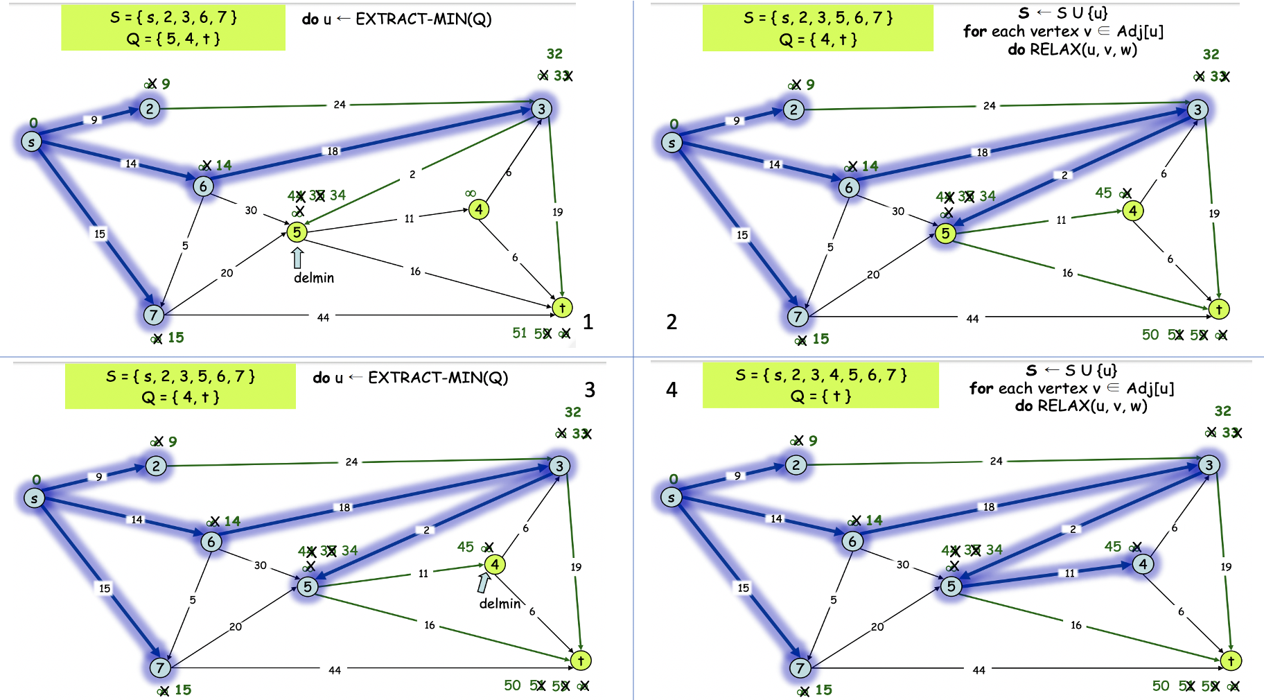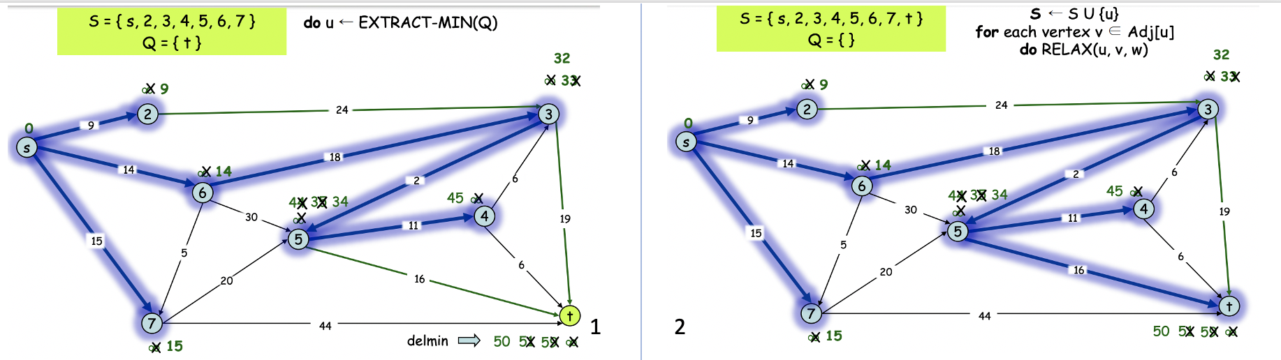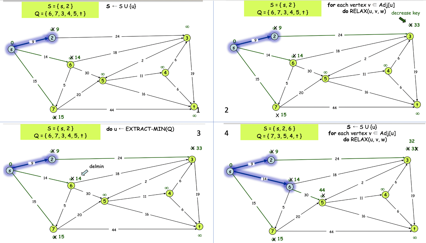 즉, priority queue에서 하나씩 꺼내면서, 꺼낸 vertex와 근접한 원소를 relaxation 시켜주고 꺼낸 원소를 S에 넣는다.