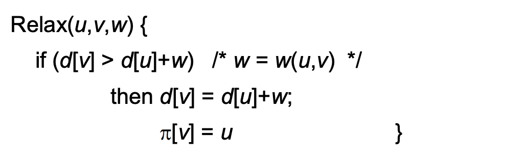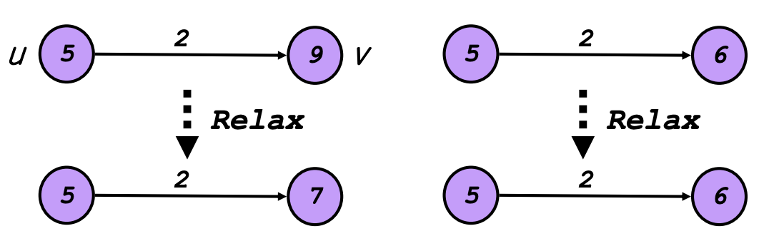 만일 v까지의 현재 최단 경로 d[v] 보다 d[u]를 거치고 가는게 더 빠르면 relaxation 한다.