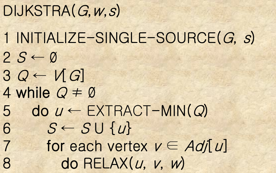 2개의 Vertex set이 존재해서 S는 최종, Q는 vertex가 담겨져있는 priority queue이다. Q에서 하나씩 꺼내기를 반복하면서 최단거리를 찾고, 꺼낸 vertex를 S에 넣는다.